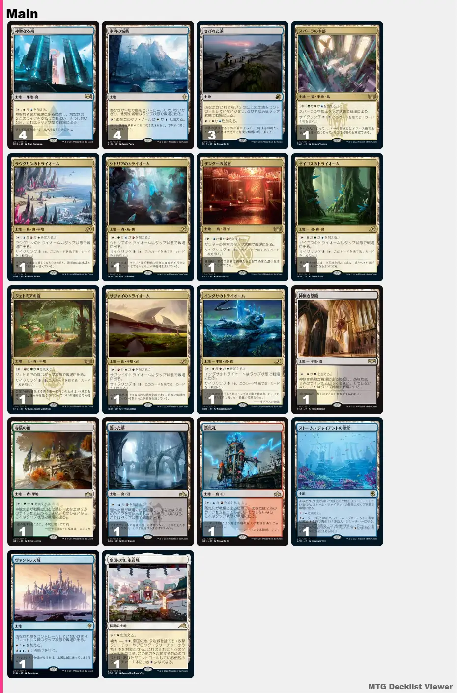 パイオニアが2マナアクションが必要不可欠である早いスピードである状況なので、2点のダメージは正直きつい。だからといって、トライオームを増やして、タップインが増えれば同じように展開が早いデッキに太刀打ちできません。