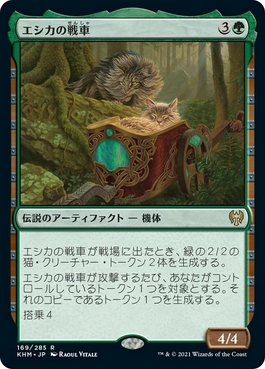 《エシカの戦車》は場に1枚、墓地に1枚、《大牙勢団の総長、脂牙》が場にあるときは《エシカの戦車》をリアニメイトして伝説ルールで片方を墓地に落とし次のターンにまた《エシカの戦車》をリアニメイトしてトークンを生成してきます。毎ターン2体のトークンを出してくるコンボです。
